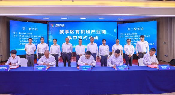 7月19日上午,猇亭区有机硅产业链集中签约活动在宜昌城区举行。本次集中签约项目5个,总投资100亿元。其中,50亿元项目1个,20亿元项目2个,5亿元项目2个。项目的签约落地将进一步完善猇亭区有机硅产业链,提升产业层次和集聚吸附能力,为猇亭区高质量发展注入新动能。